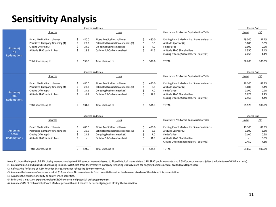 Sensitivity Analysis Sources and Uses Shares Out Sources Uses Illustrative Pro-Forma Capitalization Table (mm) (%) Picard Medical Inc. roll-over $ 480.0 Picard Medical Inc. roll-over $ 480.0 Existing Picard Medical Inc. Shareholders (1) 49.300 87.7% Permitted Company Financing (4) $ 20.0 Estimated transaction expenses (5) $ 6.5 Altitude Sponsor (2) 3.000 5.3% Closing Offering (3) $ 24.5 On-going business needs (6) $ 7.0 Finder's Fee 0.100 0.2% Assuming Altitude SPAC cash, in Trust $ 13.5 Cash to PubCo balance sheet $ 44.5 Altitude SPAC Shareholders 1.350 2.4% No Closing Offering Shareholders - Equity (3) 2.450 4.4% Redemptions Total Sources, up to $ 538.0 Total Uses, up to $ 538.0 TOTAL 56.200 100.0% Sources and Uses Shares Out Sources Uses Illustrative Pro-Forma Capitalization Table (mm) (%) Picard Medical Inc. roll-over $ 480.0 Picard Medical Inc. roll-over $ 480.0 Existing Picard Medical Inc. Shareholders (1) 49.300 88.8% Permitted Company Financing (4) $ 20.0 Estimated transaction expenses (5) $ 6.5 Altitude Sponsor (2) 3.000 5.4% Closing Offering (3) $ 24.5 On-going business needs (6) $ 7.0 Finder's Fee 0.100 0.2% Assuming Altitude SPAC cash, in Trust $ 6.8 Cash to PubCo balance sheet $ 37.8 Altitude SPAC Shareholders 0.675 1.2% 50% Closing Offering Shareholders - Equity (3) 2.450 4.4% Redemptions Total Sources, up to $ 531.3 Total Uses, up to $ 531.3 TOTAL 55.525 100.0% Sources and Uses Shares Out Sources Uses Illustrative Pro-Forma Capitalization Table (mm) (%) Picard Medical Inc. roll-over $ 480.0 Picard Medical Inc. roll-over $ 480.0 Existing Picard Medical Inc. Shareholders (1) 49.300 89.9% Assuming Permitted Company Financing (4) $ 20.0 Estimated transaction expenses (5) $ 6.5 Altitude Sponsor (2) 3.000 5.5% 100% Closing Offering (3) $ 24.5 On-going business needs (6) $ 7.0 Finder's Fee 0.100 0.2% Redemptions Altitude SPAC cash, in Trust $ - Cash to PubCo balance sheet $ 31.0 Altitude SPAC Shareholders - 0.0% Closing Offering Shareholders - Equity (3) 2.450 4.5% Total Sources, up to $ 524.5 Total Uses, up to $ 524.5 TOTAL 54.850 100.0% Note: Excludes the impact of 6.5M closing warrants and up to 6.5M earnout warrants issued to Picard Medical shareholders, 15M SPAC public warrants, and 1.5M Sponsor warrants (after the forfeiture of 6.5M warrants). (1) Calculated as $480M plus $13M of Closing Cash (ie, $20M cash from the Permitted Company Financing less $7M used for ongoing business needs), divided by $10 per share. (2) Reflects the forfeiture of 4.5M Founder Shares. Does not reflect the Sponsor earnout. (3) Assumes the issuance of common stock at $10 per share. No commitments from potential investors has been received as of the date of this presentation. (4) Assumes the issuance of equity or equity-linked securities. (5) Estimated transaction expenses exclude D&O insurance and potential brokerage expenses. (6) Assumes $1M of cash used by Picard Medical per month and 7 months between signing and closing the transaction. Confidential 11 11