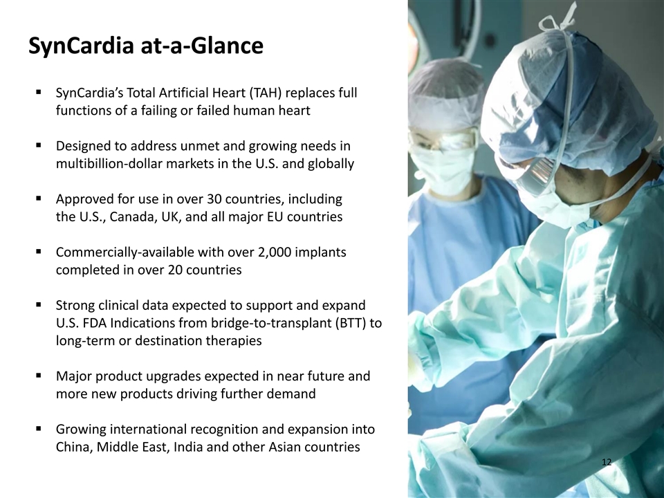 Internationally, there remains a substantial and growing market opportunity to provide end-stage heart failure patients with wider access to TAH replacement therapy. SynCardias TAH has produced strong clinical results, shown proven efficacy, and is able to treat a broader range of patients in this population compared to competing TAH products. SynCardia is expanding its manufacturing capabilities, pursuing regulatory approvals, and training new physicians across key growth regions, including China, India, and the Middle East.
