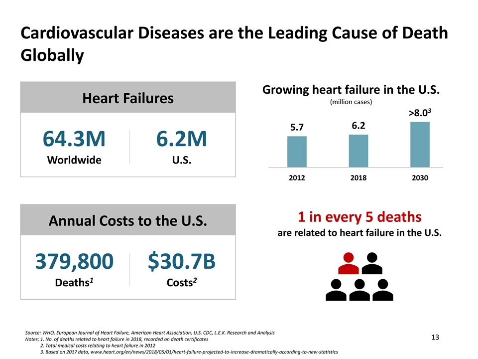 Cardiovascular disease is the leading cause of death globally and has resulted in 64.3 million heart failure patients worldwide. SynCardias TAH has been designed to address the growing and unmet needs of this patient population, which represents a multi-billion-dollar market opportunity.