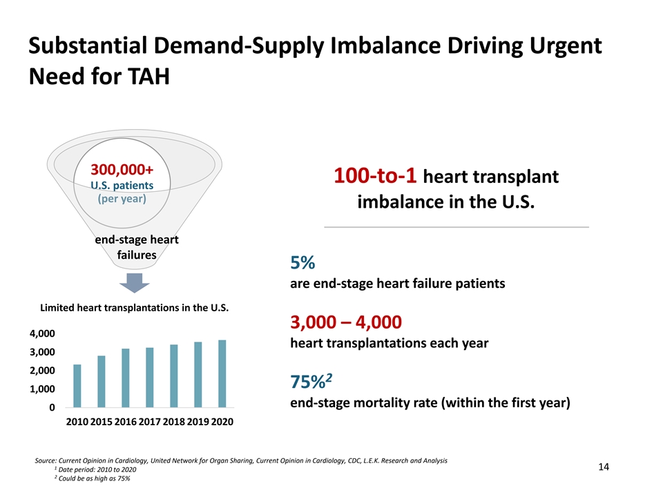 Substantial Demand-Supply Imbalance Driving Urgent Need for TAH 300,000+ 100-to-1 heart transplant U.S. patients (per year) imbalance in the U.S. end-stage heart failures 5% are end-stage heart failure patients Limited heart transplantations in the U.S. 3,000 – 4,000 4,000 heart transplantations each year 3,000 2,000 2 75% 1,000 end-stage mortality rate (within the first year) 0 2010 2015 2016 2017 2018 2019 2020 Source: Current Opinion in Cardiology, United Network for Organ Sharing, Current Opinion in Cardiology, CDC, L.E.K. Research and Analysis Confidential 1 14 Date period: 2010 to 2020 14 2 Could be as high as 75%