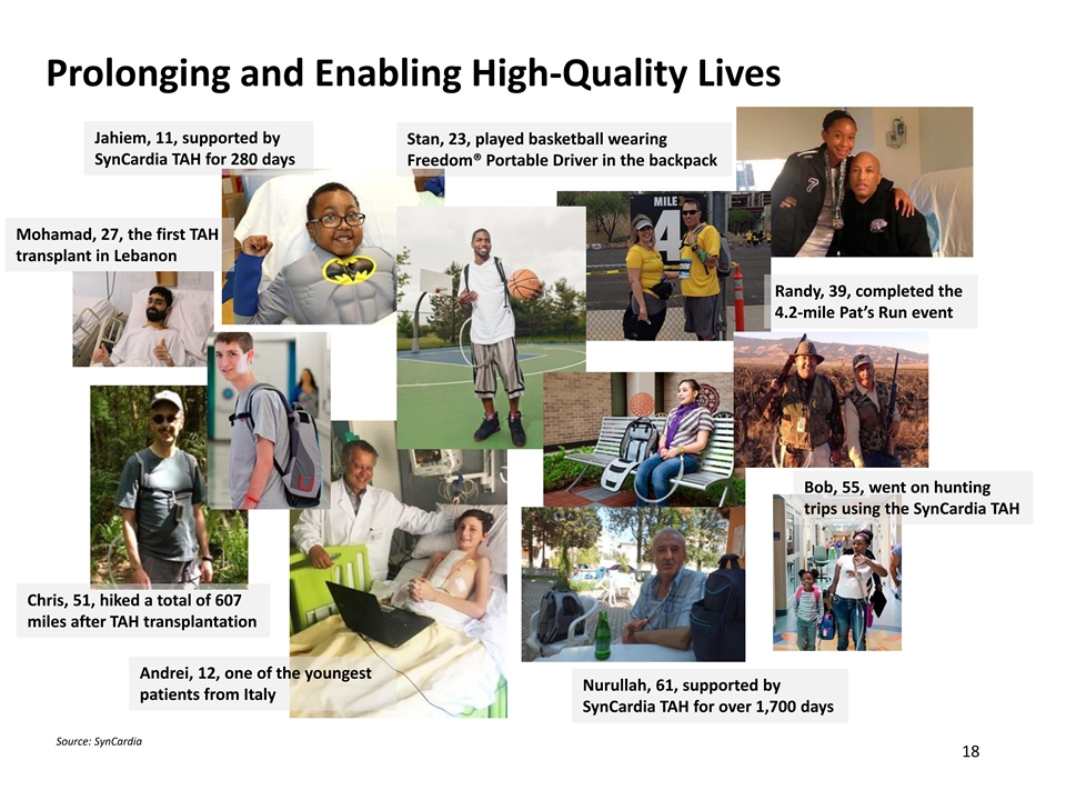 Strong Clinical Results and Proven Efficacy 79% Survival rate to transplantation (vs. 46% in control group) 70% Survival rate at 1-year (vs. 31% in control group) Over 60% Patients survived over 2 years or successfully transplanted Just over 6 years Longest living patient on SynCardia TAH Source: The New England Journal of Medicine, SynCardia Confidential 17 17