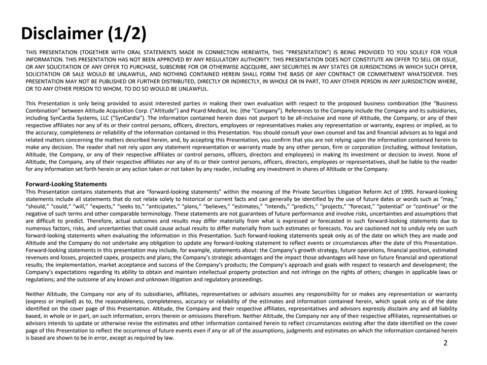Disclaimer (1/2) THIS PRESENTATION (TOGETHER WITH ORAL STATEMENTS MADE IN CONNECTION HEREWITH, THIS “PRESENTATION”) IS BEING PROVIDED TO YOU SOLELY FOR YOUR INFORMATION. THIS PRESENTATION HAS NOT BEEN APPROVED BY ANY REGULATORY AUTHORITY. THIS PRESENTATION DOES NOT CONSTITUTE AN OFFER TO SELL OR ISSUE, OR ANY SOLICITATION OF ANY OFFER TO PURCHASE, SUBSCRIBE FOR OR OTHERWISE AQCQUIRE, ANY SECURITIES IN ANY STATES OR JURISDICTIONS IN WHICH SUCH OFFER, SOLICITATION OR SALE WOULD BE UNLAWFUL, AND NOTHING CONTAINED HEREIN SHALL FORM THE BASIS OF ANY CONTRACT OR COMMITMENT WHATSOEVER. THIS PRESENTATION MAY NOT BE PUBLISHED OR FURTHER DISTRIBUTED, DIRECTLY OR INDIRECTLY, IN WHOLE OR IN PART, TO ANY OTHER PERSON IN ANY JURISDICTION WHERE, OR TO ANY OTHER PERSON TO WHOM, TO DO SO WOULD BE UNLAWFUL. This Presentation is only being provided to assist interested parties in making their own evaluation with respect to the proposed business combination (the “Business Combination” between Altitude Acquisition Corp. (“Altitude”) and Picard Medical, Inc. (the “Company”). References to the Company include the Company and its subsidiaries, including SynCardia Systems, LLC (“SynCardia”). The information contained herein does not purport to be all-inclusive and none of Altitude, the Company, or any of their respective affiliates nor any of its or their control persons, officers, directors, employees or representatives makes any representation or warranty, express or implied, as to the accuracy, completeness or reliability of the information contained in this Presentation. You should consult your own counsel and tax and financial advisors as to legal and related matters concerning the matters described herein, and, by accepting this Presentation, you confirm that you are not relying upon the information contained herein to make any decision. The reader shall not rely upon any statement representation or warranty made by any other person, firm or corporation (including, without limitation, Altitude, the Company, or any of their respective affiliates or control persons, officers, directors and employees) in making its investment or decision to invest. None of Altitude, the Company, any of their respective affiliates nor any of its or their control persons, officers, directors, employees or representatives, shall be liable to the reader for any information set forth herein or any action taken or not taken by any reader, including any investment in shares of Altitude or the Company. Forward-Looking Statements This Presentation contains statements that are “forward-looking statements” within the meaning of the Private Securities Litigation Reform Act of 1995. Forward-looking statements include all statements that do not relate solely to historical or current facts and can generally be identified by the use of future dates or words such as “may,” “should,” “could,” “will,” “expects,” “seeks to,” “anticipates,” “plans,” “believes,” “estimates,” “intends,” “predicts,” “projects,” “forecast,” “potential” or “continue” or the negative of such terms and other comparable terminology. These statements are not guarantees of future performance and involve risks, uncertainties and assumptions that are difficult to predict. Therefore, actual outcomes and results may differ materially from what is expressed or forecasted in such forward-looking statements due to numerous factors, risks, and uncertainties that could cause actual results to differ materially from such estimates or forecasts. You are cautioned not to unduly rely on such forward-looking statements when evaluating the information in this Presentation. Such forward-looking statements speak only as of the date on which they are made and Altitude and the Company do not undertake any obligation to update any forward-looking statement to reflect events or circumstances after the date of this Presentation. Forward-looking statements in this presentation may include, for example, statements about: the Company’s growth strategy, future operations, financial position, estimated revenues and losses, projected capex, prospects and plans; the Company’s strategic advantages and the impact those advantages will have on future financial and operational results; the implementation, market acceptance and success of the Company’s products; the Company’s approach and goals with respect to research and development; the Company’s expectations regarding its ability to obtain and maintain intellectual property protection and not infringe on the rights of others; changes in applicable laws or regulations; and the outcome of any known and unknown litigation and regulatory proceedings. Neither Altitude, the Company nor any of its subsidiaries, affiliates, representatives or advisors assumes any responsibility for or makes any representation or warranty (express or implied) as to, the reasonableness, completeness, accuracy or reliability of the estimates and information contained herein, which speak only as of the date identified on the cover page of this Presentation. Altitude, the Company and their respective affiliates, representatives and advisors expressly disclaim any and all liability based, in whole or in part, on such information, errors therein or omissions therefrom. Neither Altitude, the Company nor any of their respective affiliates, representatives or advisors intends to update or otherwise revise the estimates and other information contained herein to reflect circumstances existing after the date identified on the cover page of this Presentation to reflect the occurrence of future events even if any or all of the assumptions, judgments and estimates on which the information contained herein is based are shown to be in error, except as required by law. Confidential 2 2