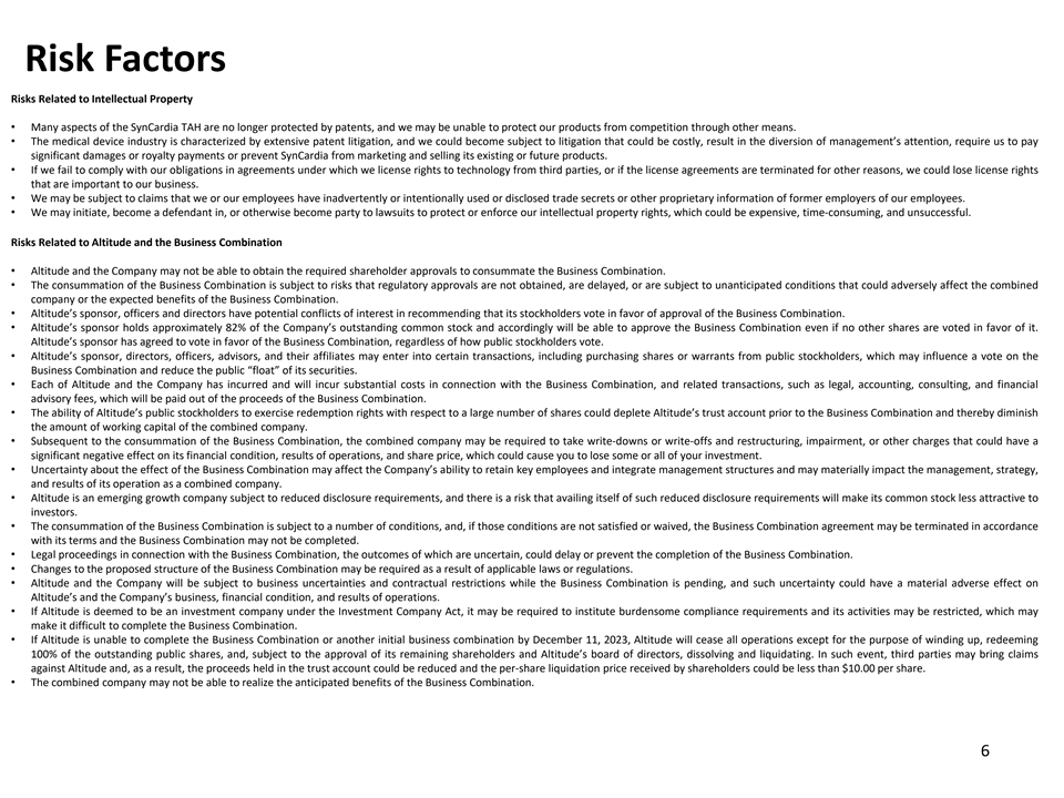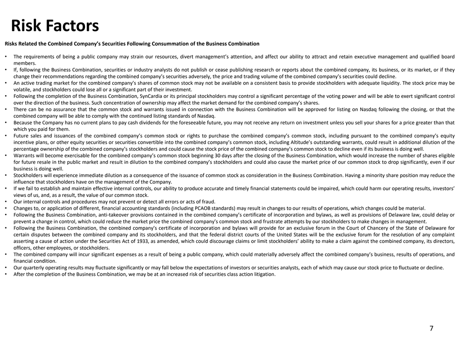 Risk Factors Risks Related to Intellectual Property • Many aspects of the SynCardia TAH are no longer protected by patents, and we may be unable to protect our products from competition through other means. • The medical device industry is characterized by extensive patent litigation, and we could become subject to litigation that could be costly, result in the diversion of management’s attention, require us to pay significant damages or royalty payments or prevent SynCardia from marketing and selling its existing or future products. • If we fail to comply with our obligations in agreements under which we license rights to technology from third parties, or if the license agreements are terminated for other reasons, we could lose license rights that are important to our business. • We may be subject to claims that we or our employees have inadvertently or intentionally used or disclosed trade secrets or other proprietary information of former employers of our employees. • We may initiate, become a defendant in, or otherwise become party to lawsuits to protect or enforce our intellectual property rights, which could be expensive, time-consuming, and unsuccessful. Risks Related to Altitude and the Business Combination • Altitude and the Company may not be able to obtain the required shareholder approvals to consummate the Business Combination. • The consummation of the Business Combination is subject to risks that regulatory approvals are not obtained, are delayed, or are subject to unanticipated conditions that could adversely affect the combined company or the expected benefits of the Business Combination. • Altitude’s sponsor, officers and directors have potential conflicts of interest in recommending that its stockholders vote in favor of approval of the Business Combination. • Altitude’s sponsor holds approximately 82% of the Company’s outstanding common stock and accordingly will be able to approve the Business Combination even if no other shares are voted in favor of it. Altitude’s sponsor has agreed to vote in favor of the Business Combination, regardless of how public stockholders vote. • Altitude’s sponsor, directors, officers, advisors, and their affiliates may enter into certain transactions, including purchasing shares or warrants from public stockholders, which may influence a vote on the Business Combination and reduce the public “float” of its securities. • Each of Altitude and the Company has incurred and will incur substantial costs in connection with the Business Combination, and related transactions, such as legal, accounting, consulting, and financial advisory fees, which will be paid out of the proceeds of the Business Combination. • The ability of Altitude’s public stockholders to exercise redemption rights with respect to a large number of shares could deplete Altitude’s trust account prior to the Business Combination and thereby diminish the amount of working capital of the combined company. • Subsequent to the consummation of the Business Combination, the combined company may be required to take write-downs or write-offs and restructuring, impairment, or other charges that could have a significant negative effect on its financial condition, results of operations, and share price, which could cause you to lose some or all of your investment. • Uncertainty about the effect of the Business Combination may affect the Company’s ability to retain key employees and integrate management structures and may materially impact the management, strategy, and results of its operation as a combined company. • Altitude is an emerging growth company subject to reduced disclosure requirements, and there is a risk that availing itself of such reduced disclosure requirements will make its common stock less attractive to investors. • The consummation of the Business Combination is subject to a number of conditions, and, if those conditions are not satisfied or waived, the Business Combination agreement may be terminated in accordance with its terms and the Business Combination may not be completed. • Legal proceedings in connection with the Business Combination, the outcomes of which are uncertain, could delay or prevent the completion of the Business Combination. • Changes to the proposed structure of the Business Combination may be required as a result of applicable laws or regulations. • Altitude and the Company will be subject to business uncertainties and contractual restrictions while the Business Combination is pending, and such uncertainty could have a material adverse effect on Altitude’s and the Company’s business, financial condition, and results of operations. • If Altitude is deemed to be an investment company under the Investment Company Act, it may be required to institute burdensome compliance requirements and its activities may be restricted, which may make it difficult to complete the Business Combination. • If Altitude is unable to complete the Business Combination or another initial business combination by December 11, 2023, Altitude will cease all operations except for the purpose of winding up, redeeming 100% of the outstanding public shares, and, subject to the approval of its remaining shareholders and Altitude’s board of directors, dissolving and liquidating. In such event, third parties may bring claims against Altitude and, as a result, the proceeds held in the trust account could be reduced and the per-share liquidation price received by shareholders could be less than $10.00 per share. • The combined company may not be able to realize the anticipated benefits of the Business Combination. Confidential 6 6
