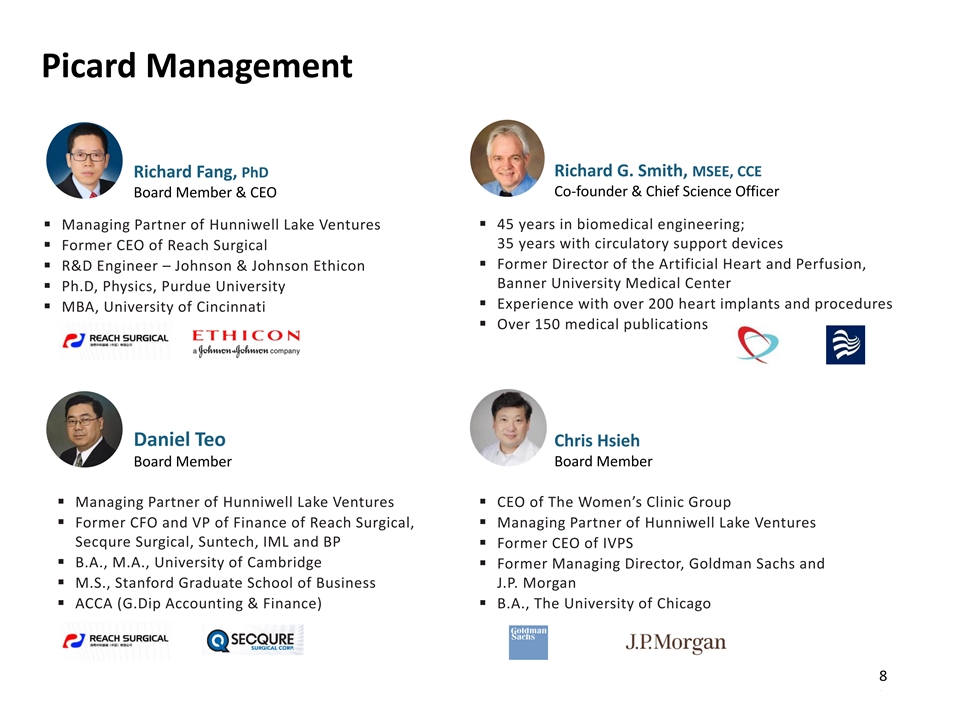 Picard Management Richard G. Smith, MSEE, CCE Richard Fang, PhD Co-founder & Chief Science Officer Board Member & CEO ▪ Managing Partner of Hunniwell Lake Ventures▪ 45 years in biomedical engineering; 35 years with circulatory support devices ▪ Former CEO of Reach Surgical ▪ Former Director of the Artificial Heart and Perfusion, ▪ R&D Engineer – Johnson & Johnson Ethicon Banner University Medical Center ▪ Ph.D, Physics, Purdue University ▪ Experience with over 200 heart implants and procedures ▪ MBA, University of Cincinnati ▪ Over 150 medical publications Daniel Teo Chris Hsieh Board Member Board Member ▪ Managing Partner of Hunniwell Lake Ventures▪ CEO of The Women’s Clinic Group ▪ Former CFO and VP of Finance of Reach Surgical, ▪ Managing Partner of Hunniwell Lake Ventures Secqure Surgical, Suntech, IML and BP ▪ Former CEO of IVPS ▪ B.A., M.A., University of Cambridge ▪ Former Managing Director, Goldman Sachs and ▪ M.S., Stanford Graduate School of Business J.P. Morgan ▪ ACCA (G.Dip Accounting & Finance) ▪ B.A., The University of Chicago Confidential 8 8